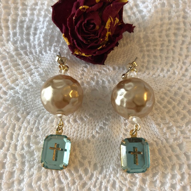 ヴィンテージパールビーズにさざれ水晶を合わせ、ヴィンテージ西ドイツ製クロスカボジョンアクアカラーのピアス
