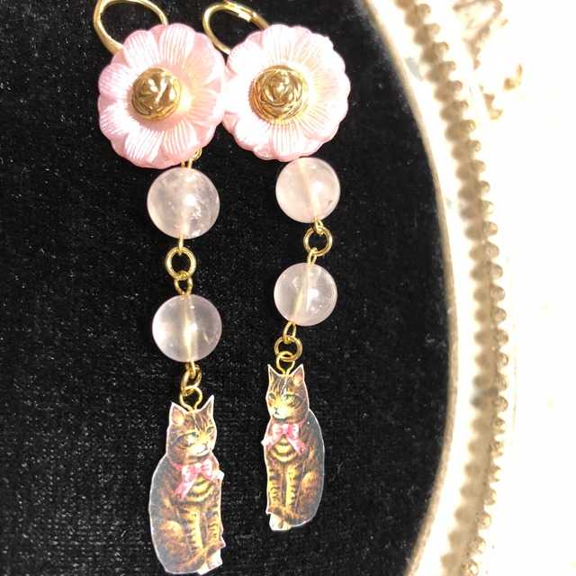 1990年代の可愛いPOPなピンクお花ボタンとローズクォーツ&デコパージュのピンクリボンのキジトラちゃんを合わせました。