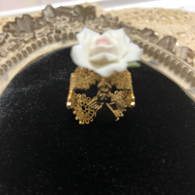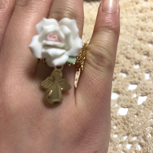 透かしレースリングにアクリルホワイトローズと可愛いエンジェルチャームを合わせました。