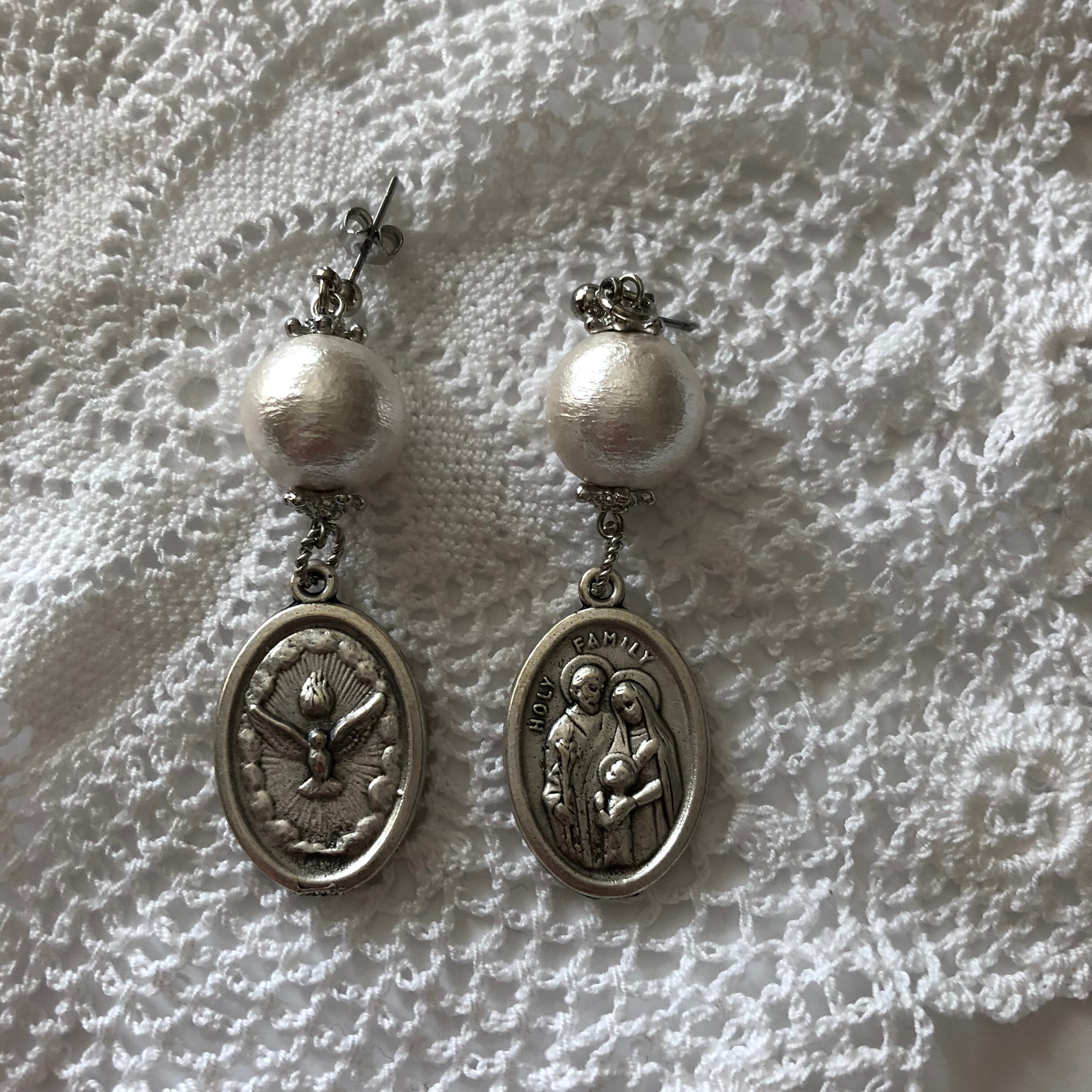 ビックコットンパールと両面メダイイタリア製、聖霊(ハト)&聖家族のメダイを合わせました。
