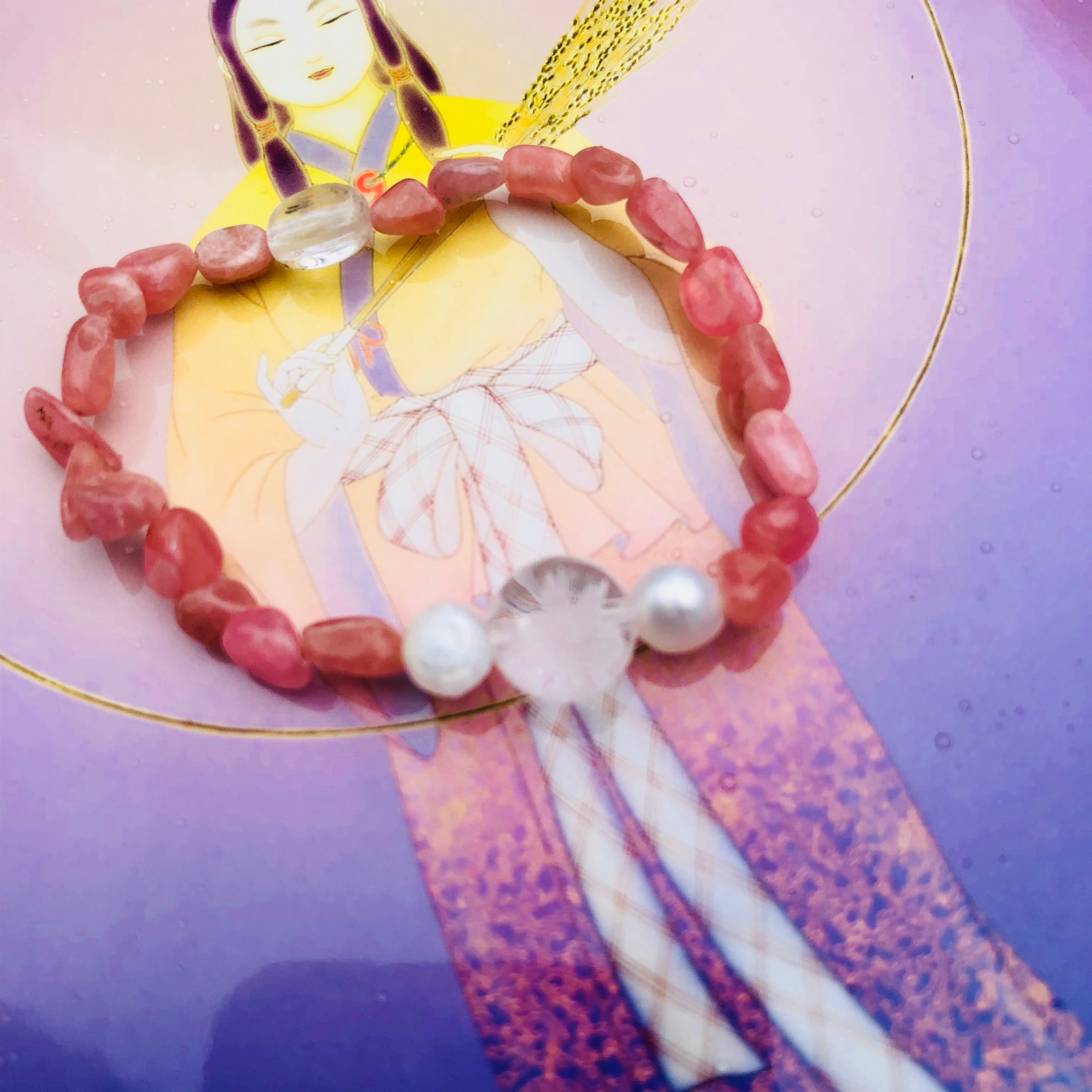 天使の彫りの水晶+淡水パール+タンブルインカローズ+クンツァイト
