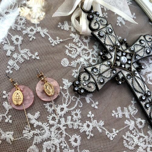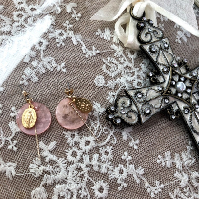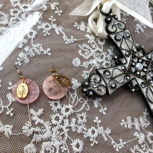 ゴールドカラーのツイストバーと奇跡のメダイのピアス。