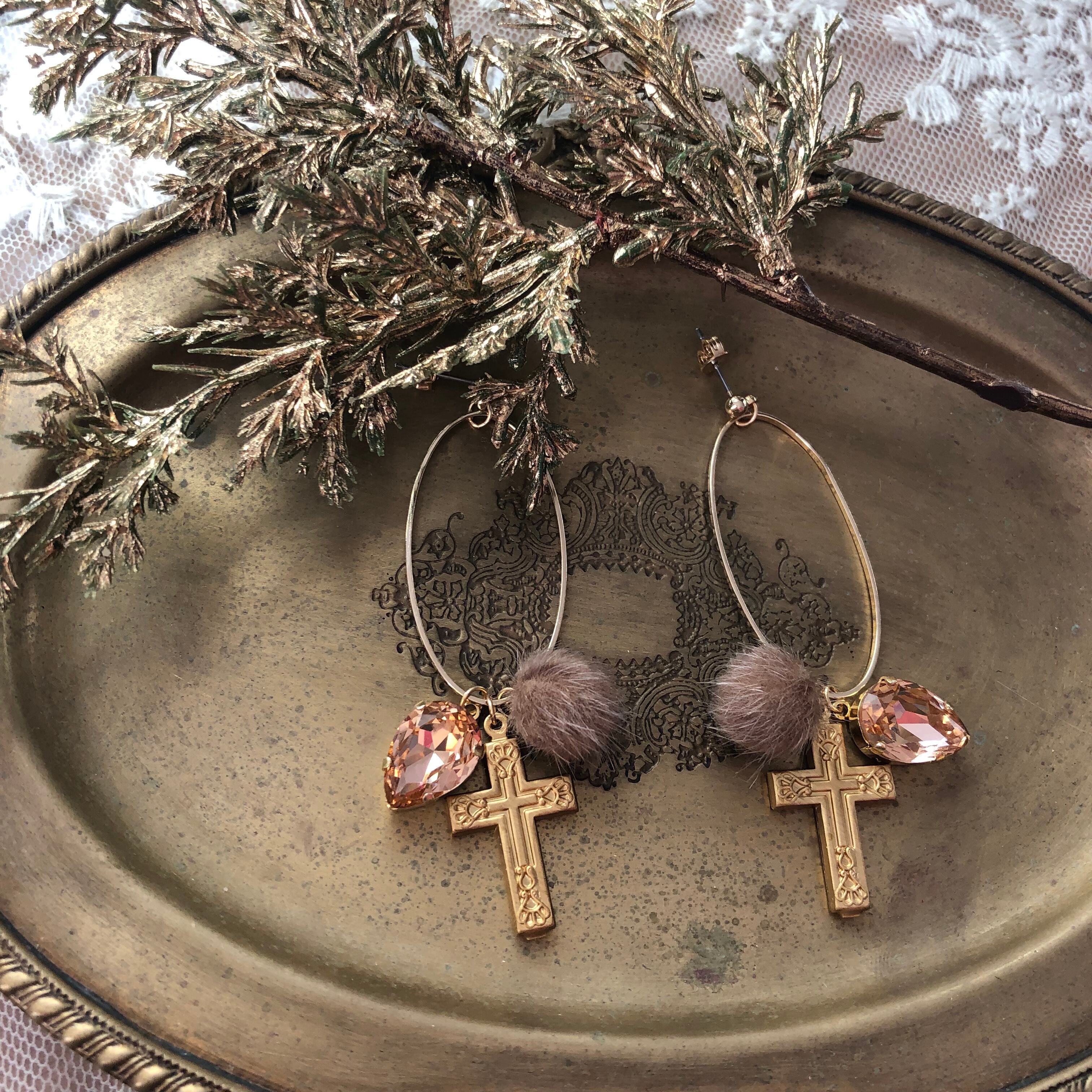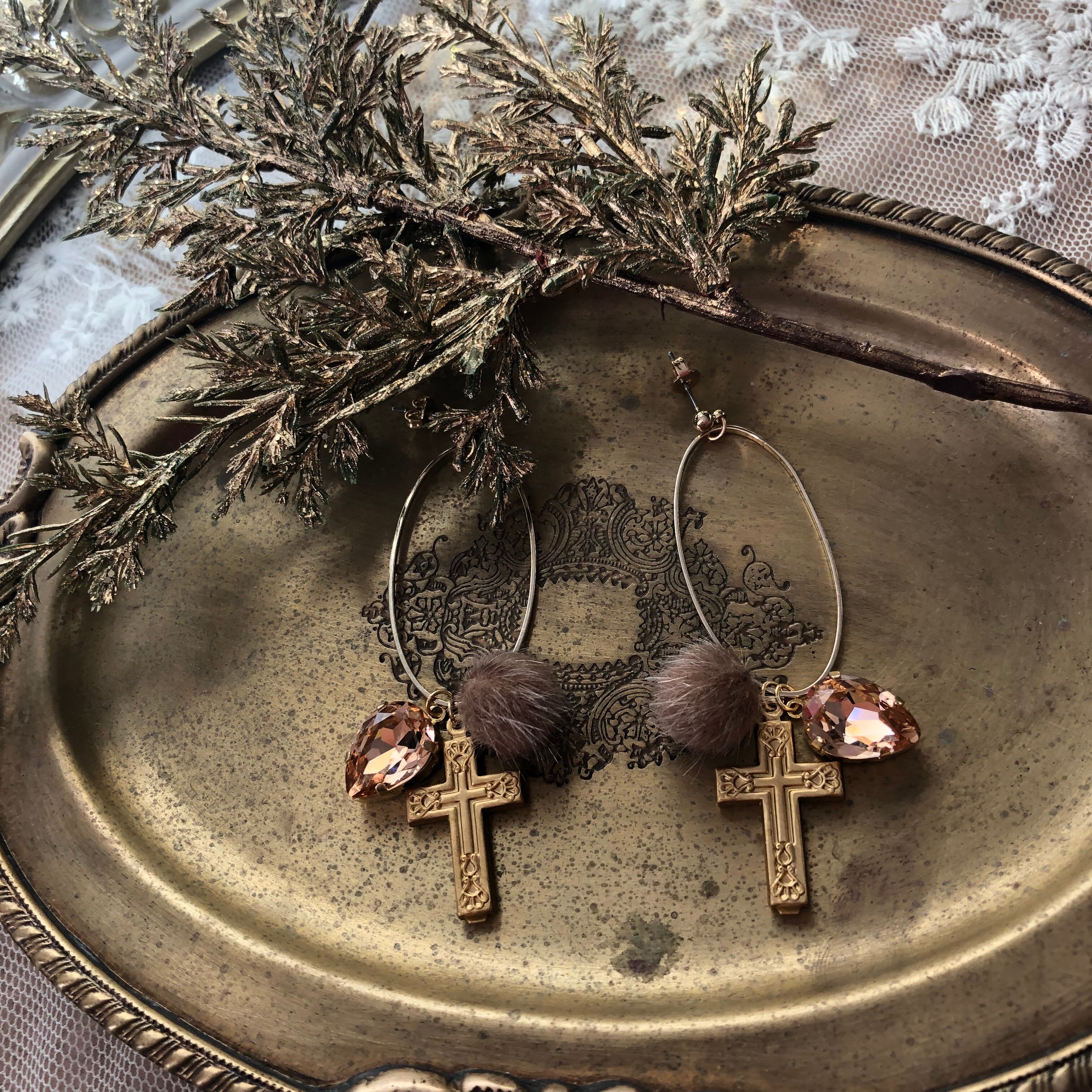 ブラス製クロスとキラキラビジューのフェイクファーのサークルピアス
