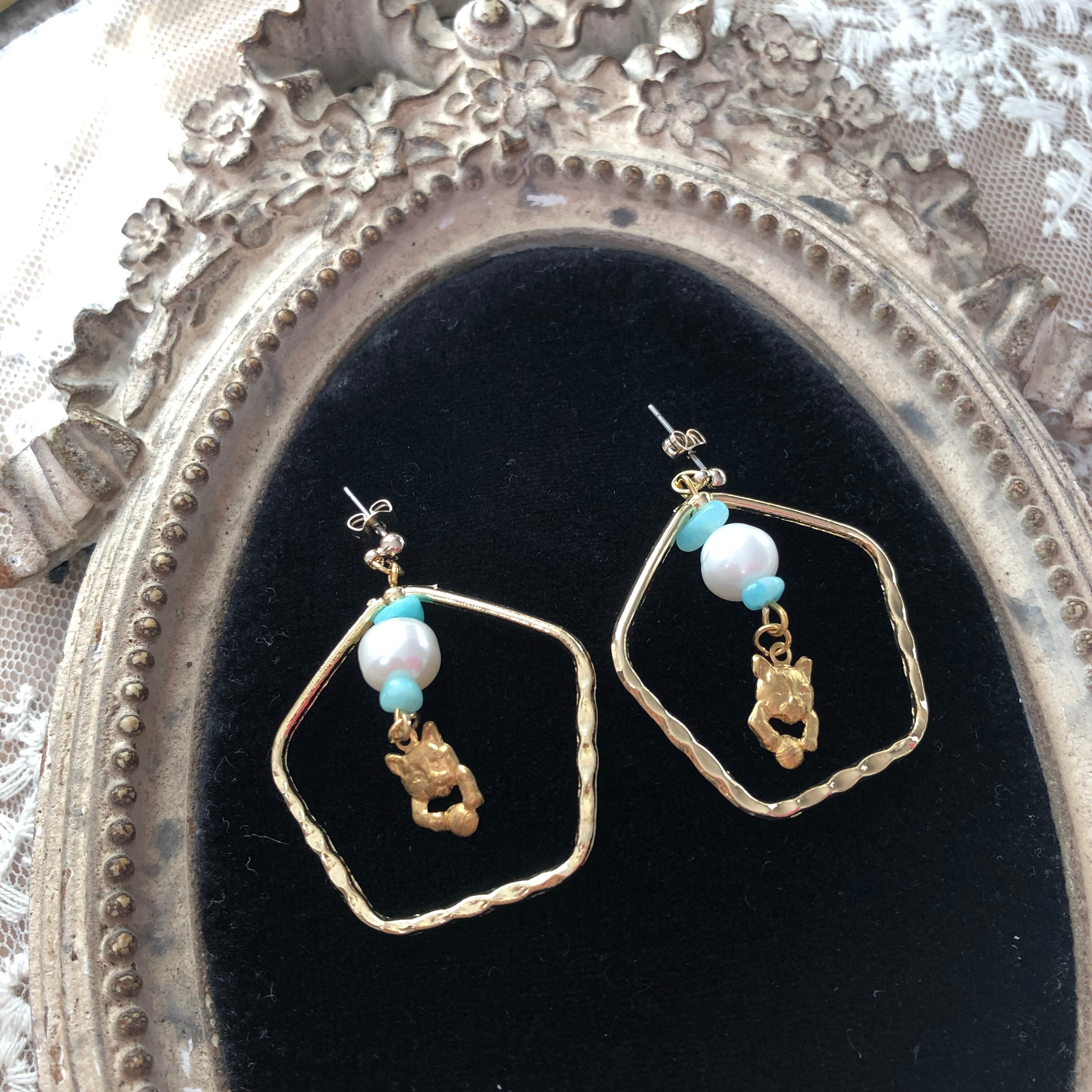 ブラス製ボールで遊んでる猫と淡水パールとアクアマリンのピアス