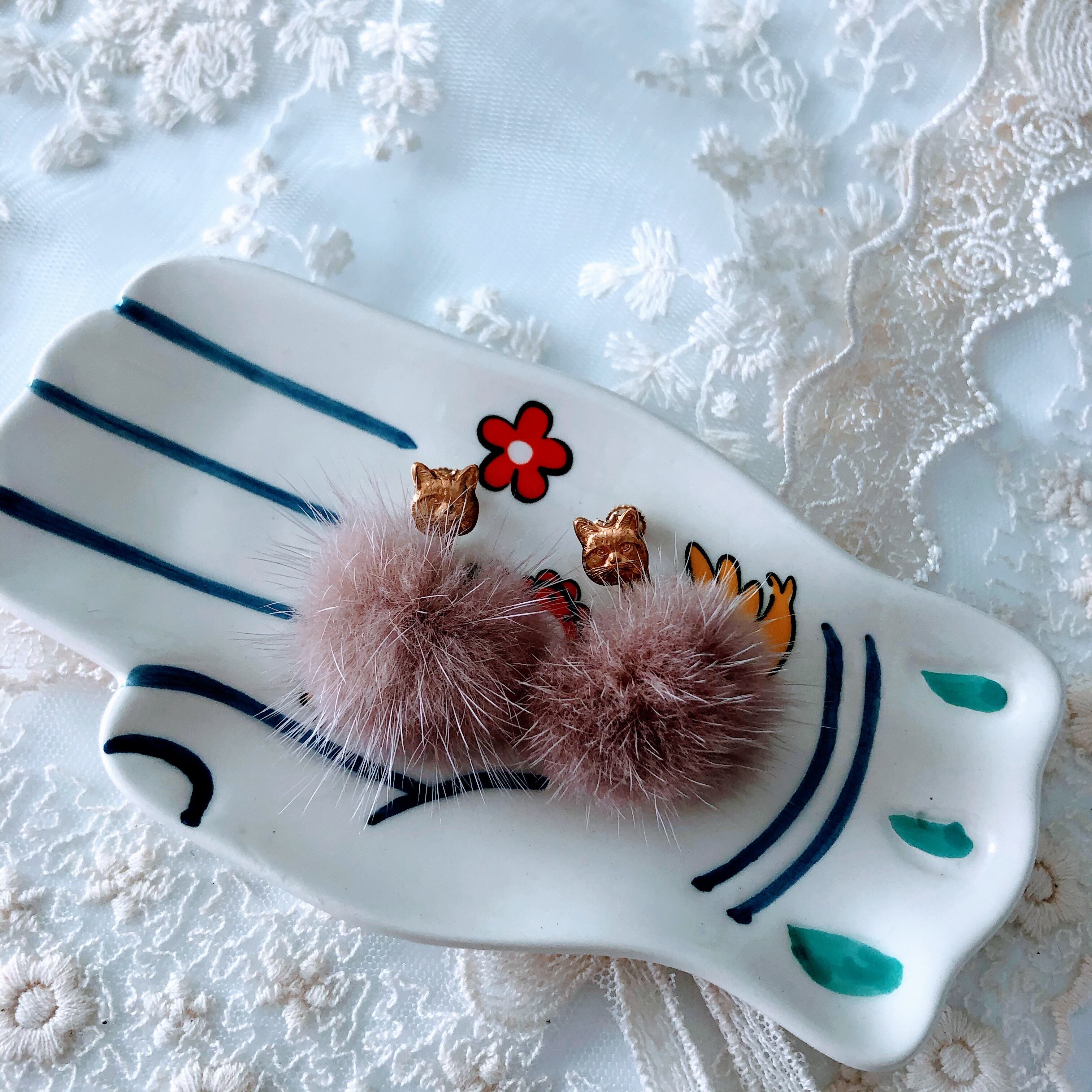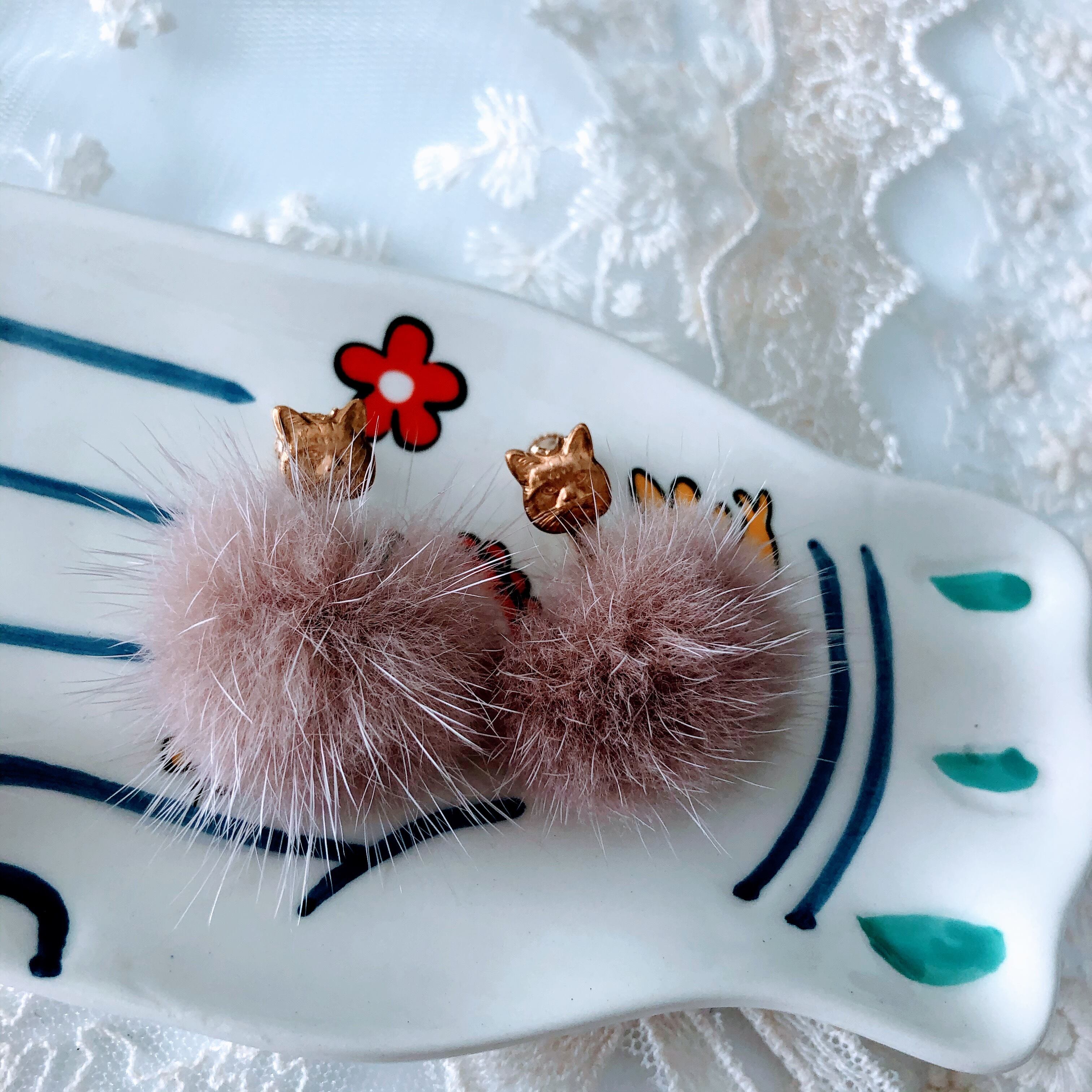 ミンクファーとフェイスキャットのイヤリング