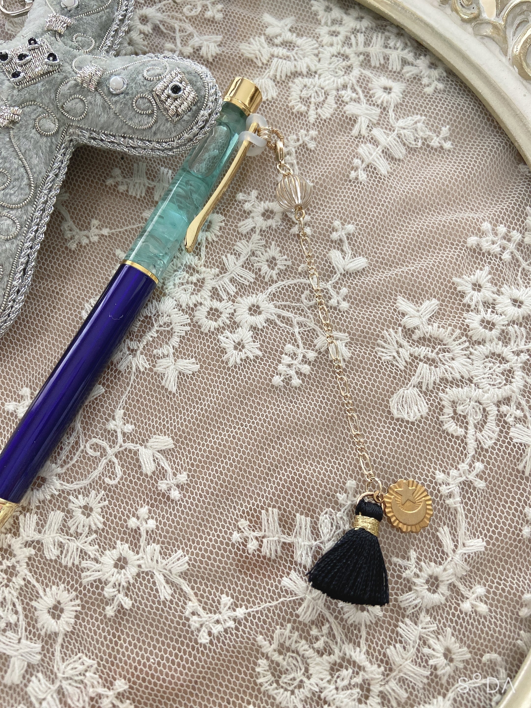 ヴィンテージビーズとクラシカルなブラックとゴールドのタッセルにブラス製のチャームを合わせました。