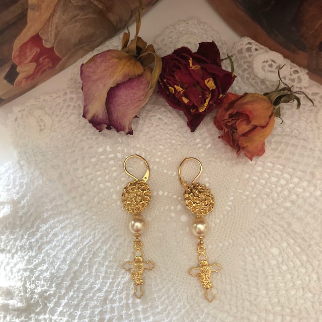 ヴィンテージに近いインポートゴールドボタンを使いグラスパールとイタリア製カリス&ホスチア麦ブドウクロスを合わせました。